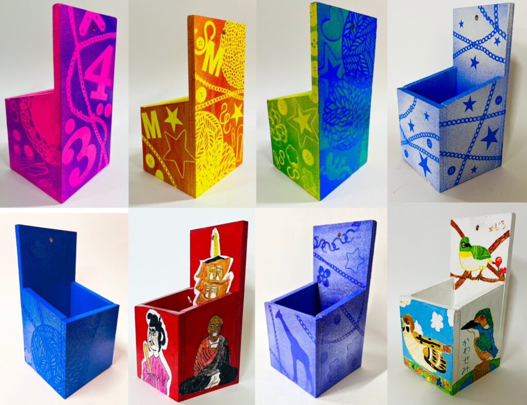 2025.10.20 子どもたちが木箱の工作をしました。低学年は彩色するだけ。 4年生以上は組み立てて、彩色しました。 上左から:中3女子、中2女子、中3女子、小5女子 下左から:小6女子、小6男子、小6女子、小4女子 低学年は彩色するだけ。 4年生以上は組み立てて、彩色しました。 上左から:中3女子、中2女子、中3女子、小5女子 下左から:小6女子、小6男子、小6女子、小4女子 教室からのお知らせ 教室の皆さんの作品 教室の歩み