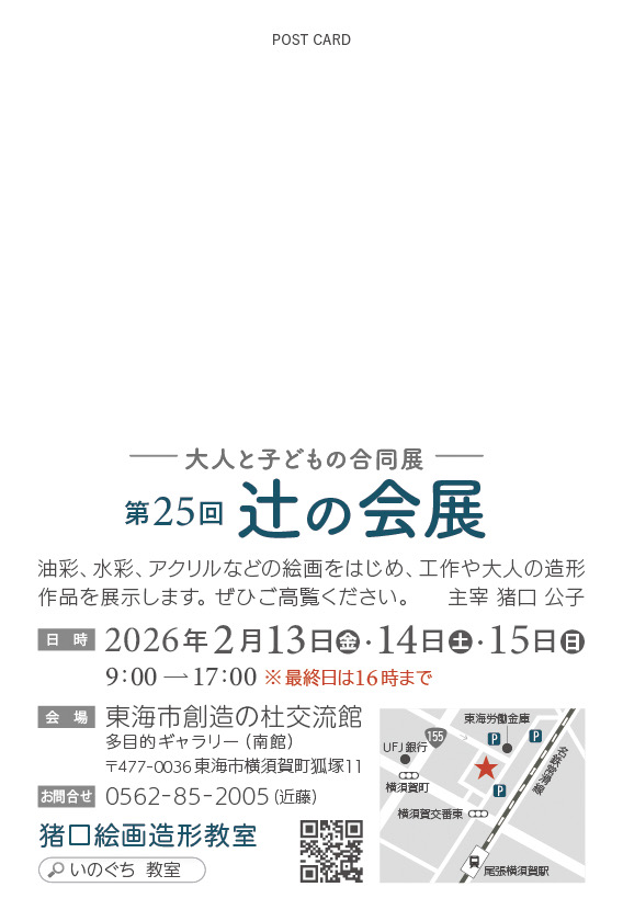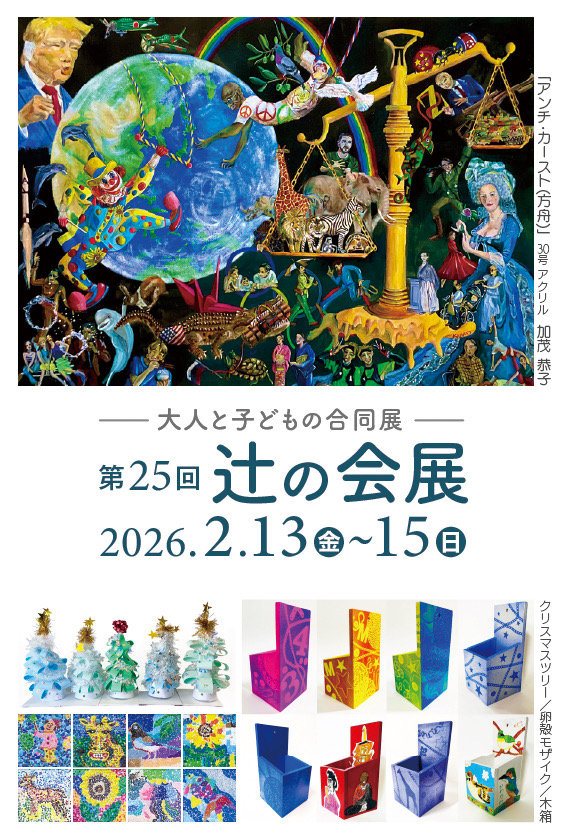 2026.01.08 第25回辻の会 −大人と子どもの合同展− DM あけましておめでとうございます。 第25回辻の会 −大人と子どもの合同展−のDMができました。 会場は、旧東海市文化センター跡に新しくオープンした東海市創造の杜交流館です。 期間は、2026年2月13日(金)から15日(日)までです。 掲載写真の「アンチ・カースト」は作者の加茂さんがちょうど一年かけて制作したものです。 子どもたちの楽しい作品も沢山出品します。 ぜひご覧下さい。 教室からのお知らせ 教室の皆さんの作品 教室の歩み